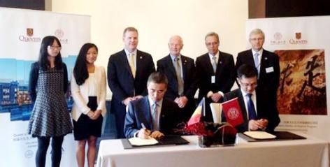 参加签约仪式的有:加拿大女王大学中国代表处专员张志尧(前排左),汉青研究院院长助理邱志刚(前右一),中国人民大学与加拿大女王大学金融硕士项目负责人、 女王大学经济学博士戴田甜(左一),加拿大女王大学在中国地区招生负责人戴安娜.张(左二), 加拿大外交部部长约翰·贝尔德(左三) 、加拿大现任总督大卫.约翰斯顿(右三),加拿大能源部部长乔·奥利弗(右二) ,以及加拿大驻华大使赵朴(右一)