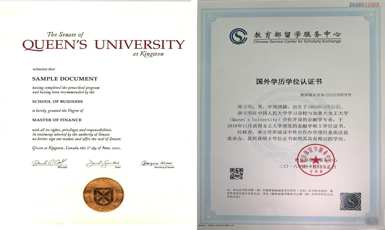 (图例:左,2013年加拿大女王大学颁发证书;右,2018年中国教育部留学服务中心认证证书)