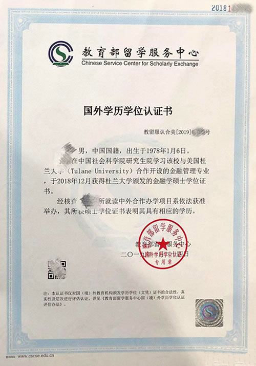| 毕业文凭 | 1.杜兰大学金融管理硕士(Master of Finance)学位证书2.教育部留学服务中心学历学位认证证书 3.中国社会科学院研究生院金融管理硕士班结业证书 |