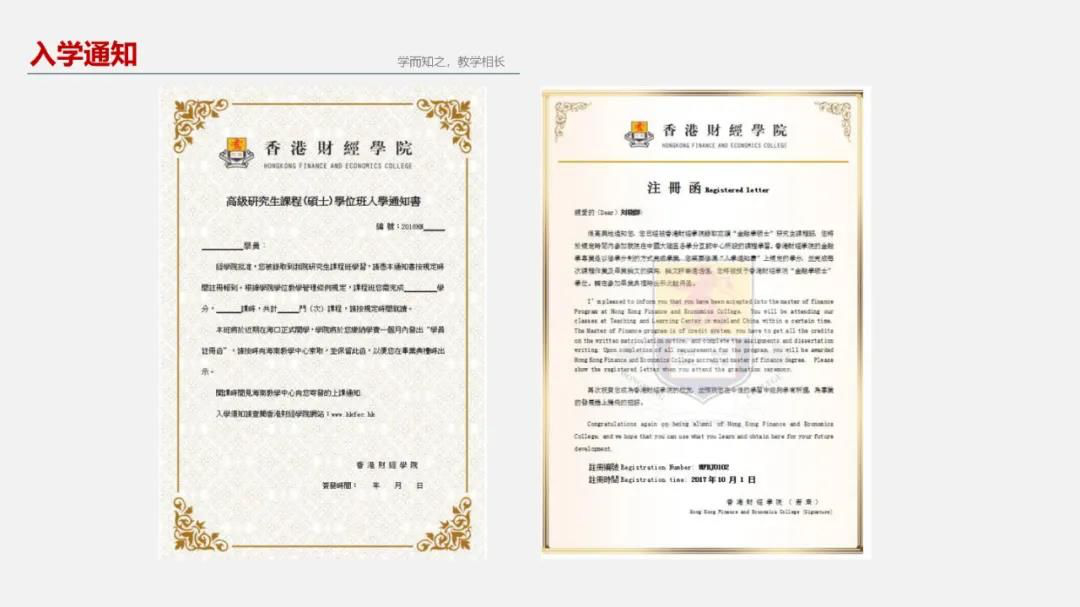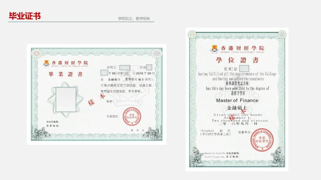 依据香港财经学院和内地教学机构签订的“学分互认证明”, 学员在内地教学机构所修课程学分全部被香港 财经学院所认可。学员修满42分,颁发香港财经学院研究生毕业证书;论文评审通过者,颁发香港财经学院 硕士学位证书。